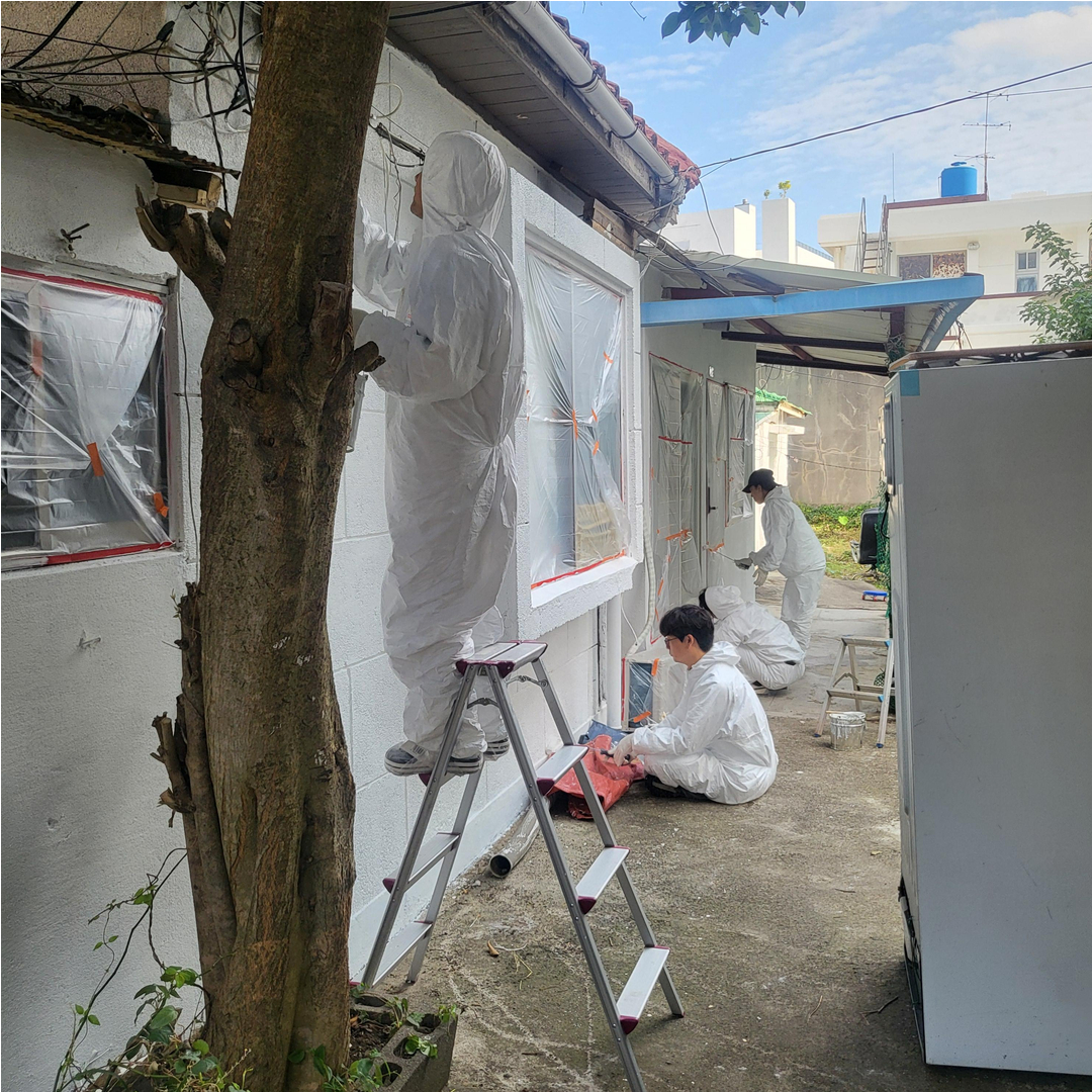 제주지역위원회에서 2022년부터 4년째 계속되고 있는 '나눔봉사활동'은 독거 어르신이나 사회 취약계층이 사는 집의 외벽을 새롭게 단장해주는 활동이에요. 올해는 예멘과 인도 등에서 온 국제 난민분들이 머무는 삶터를 찾아가, 상반기와 하반기 두 번에 걸쳐 페인트 봉사를 진행했어요.