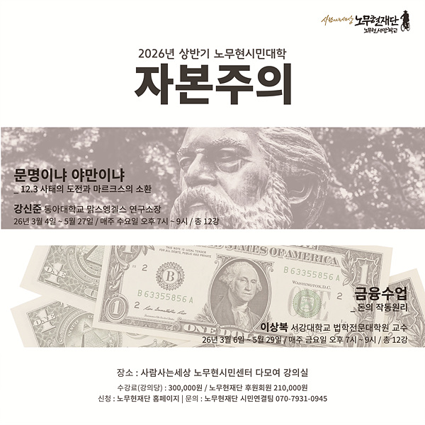 학습하는 시민을 위해 프레시안과 함께 '노무현시민대학'을 시작합니다! 2026년 상반기에 다룰 첫 번째 주제는 바로 우리 삶과 떼려야 뗄 수 없는 '자본주의'입니다. 🌍💸